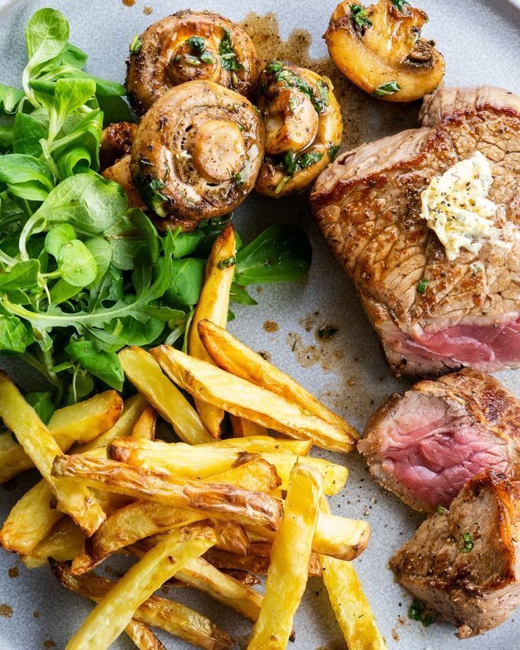 Rosé gebakken rundersteak met roergebakken paddenstoelen | visschotel met bijpassende roomsaus | gemarineerde kipstukjes met satésaus | lintpasta met romige saus en gegrilde groenten | groente Wellington | skin-on wedges | roergebakken seizoensgroenten
