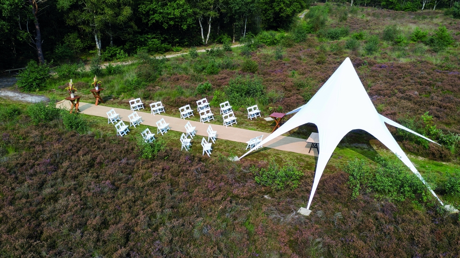 Bos en heide vormen op Westerbergen het natuurlijke decor voor evenementen en huwelijken in de buitenlucht. Op ons eigen terrein, midden in het Drentse landschap, is ruimte voor ceremonies, diners en zakelijke samenkomsten met rust en privacy.Van een intieme bruiloft tot een groter evenement, wij combineren de kracht van de natuur met goede faciliteiten en persoonlijke begeleiding. Zo ontstaat een locatie waar buiten zijn vanzelfsprekend is en waar samen zijn echt de ruimte krijgt. Het Echten Drenthe gevoel.